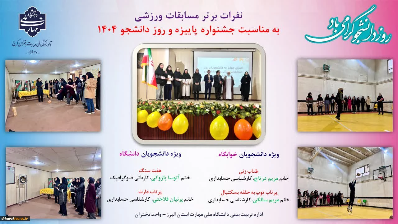 امتیاز دهید : گزارش مسابقات ورزشی به مناسبت جشنواره پاییزه و روز دانشجو در آموزشکده ملی مهارت دختران کرج 2 شنبه 22 آذر 1404 ساعت 8:27